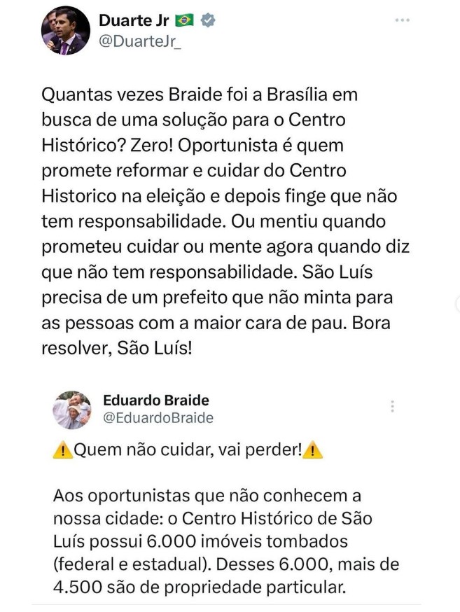 As farpas iniciaram quando Duarte publicou um vídeo onde Braide e sua vice, Esmênia Miranda, durante a campanha de 2020, aparecem prometendo revitalizar a área histórica. “Braide, aceita a nossa ajuda! Nosso Centro Histórico precisa reviver. Somos patrimônio histórico da humanidade. Nossa cultura, nossa história não pode se perder entre escombros”, afirmou o socialista.