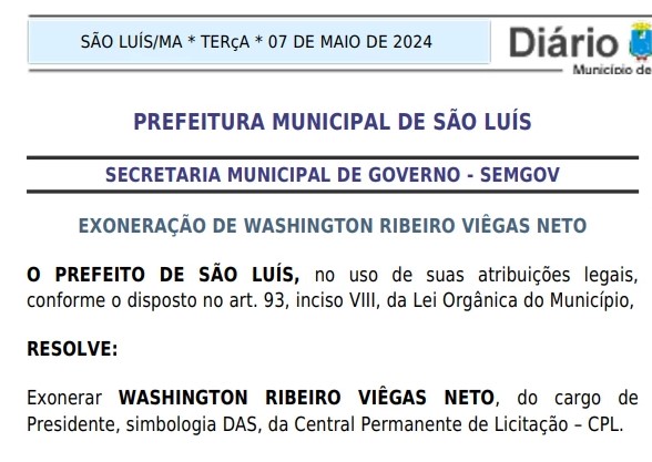 Após a contratação do ex-assessor por R$ 18 milhões, o prefeito de São Luís, Eduardo Braide (PSD), exonerou o presidente da da Central Permanente de Licitação (CPL) do Município, Washington Ribeiro Viêgas Neto.