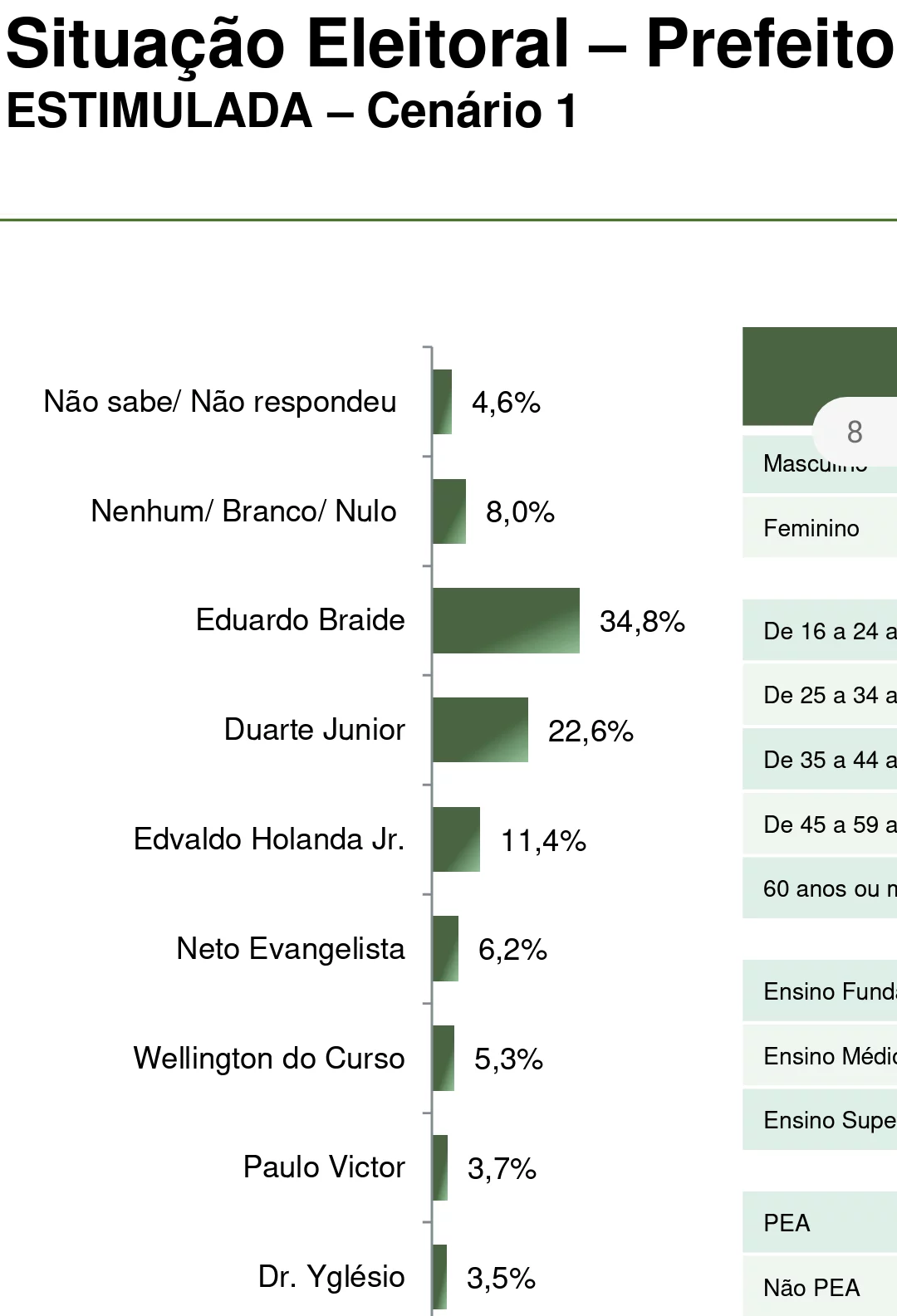 No cenário estimulado, Eduardo Braide (PSD), aparece com 34,8% das intenções de votos, em segundo vem o deputado Duarte Junior (PSB), com 22,6%, depois Edvaldo Holanda Jr. (PSD), com 11,4%, e Neto Evangelista(União), com 6,2%. O deputado Wellington do Curso aparece com 5,3%, o vereador Paulo Victor (PSDB), que retirou sua pré-candidatura ontem, tem 3,7% e Dr. Yglésio pontua com 3,5%, segundo a sondagem da Paraná Pesquisas.