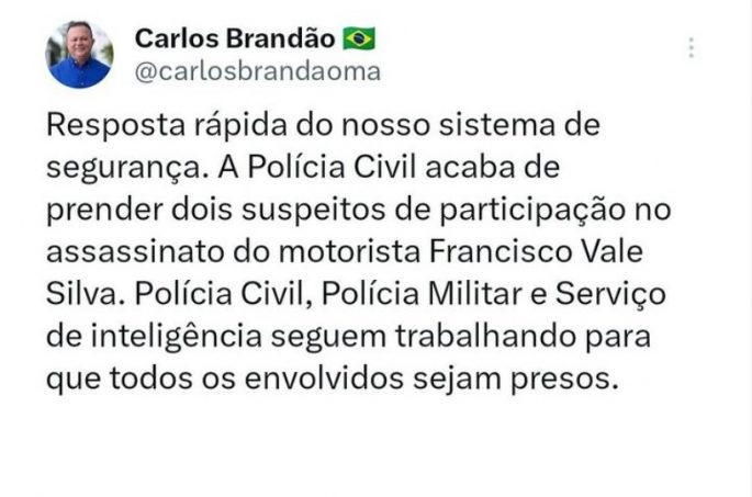 “Resposta rápida do nosso sistema de segurança. A Polícia Civil acaba de prender dois suspeitos de participação no assassinato do motorista Francisco Vale Silva. Polícia Civil, Polícia Militar e Serviço de inteligência seguem trabalhando para que todos os envolvidos sejam presos”, escreveu Brandão.