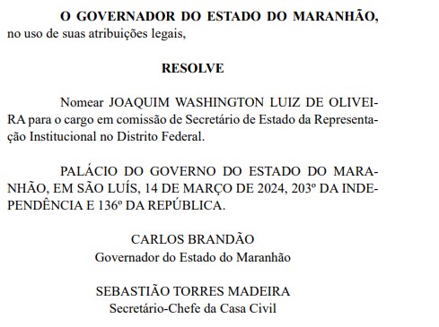 O ex-conselheiro do Tribunal de Contas do Estado (TCE), Washington Oliveira, foi confirmado no comando da Secretaria de Estado da Representação Institucional do Maranhão no Distrito Federal.