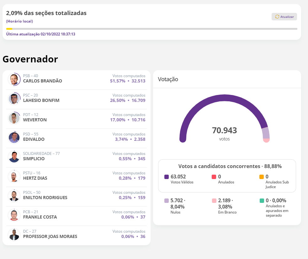 Brandão continua na frente da corrida eleitoral, seguido de Lahésio Bonfim 02/10/2022 | PÁGINA PRINCIPAL, Notícias Navegação de Post Flávio Dino vai garantindo a vaga para o SenadoBrandão com 50,22%, Lahésio com 26,07% e Weverton com 18,85%