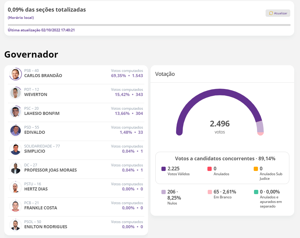 Brandão segue liderando eleição no Maranhão 02/10/2022 | PÁGINA PRINCIPAL, Notícias Com 0,09% das seções totalizadas, Brandão lidera com 69,35%, totalizando 1.543 votos, Weverton em segundo com 15,42%. Navegação de Post Flávio Dino está na frente da disputa pelo SenadoBolsonaro com 48,39% e Lula com 41,50%