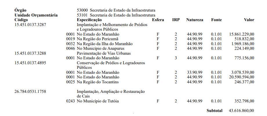 Desse montante, saíram R$ 43.616.860,00 milhões para a Sinfra executar um pacote de serviços de melhoramento e conservação de prédios e logradouros públicos, pavimentação de ruas e restauração de cais nas regiões do Pericumã, do Tocantins e Metropolitana de São Luís, além dos municípios de Anapuru e Tutóia.