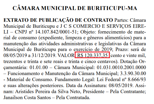 A Câmara de Vereadores de Buriticupu contratou a J.C.S Comércio e Serviços por cifras altísssimas.
