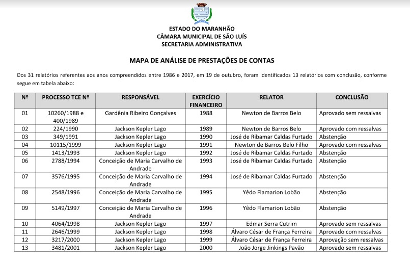 Dos 31 relatórios referentes aos anos compreendidos entre 1986 e 2017, foram identificados 13 relatórios com conclusão relativos às contas de 1988, de responsabilidades de Gardênia Gonçalves, aprovado com ressalvas; 1989, 1990, 1991 e 1992, de responsabilidades de Jackson Lago, também aprovadas com ressalvas; 1993, 1994, 1995 e 1996, de responsabilidades de Conceição Andrade, que teve parecer prévio com abstenção; e 1997, 1998, 1999 e 2000, também de responsabilidades de Jackson Lago, aprovadas com ressalvas.