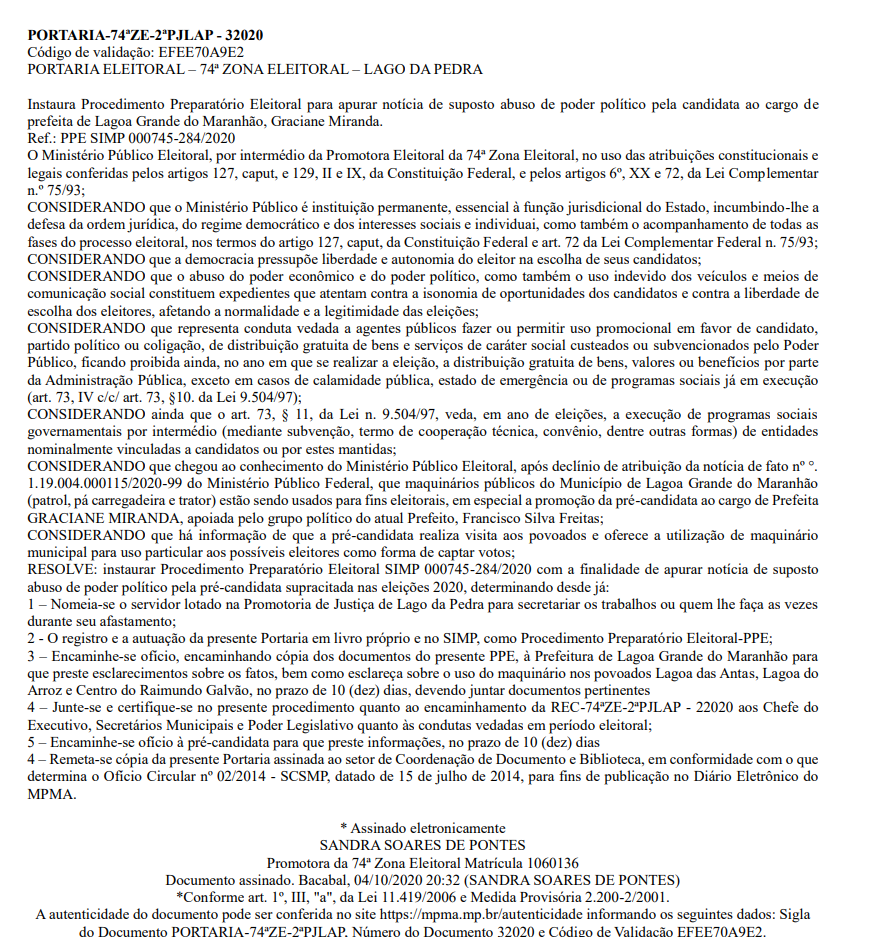 A representante do Parquet notificou ao Executivo de Lagoa Grande para que o prefeito se pronuncie e esclareça em 10 dias sobre o uso do maquinário nos povoados Lagoa das Antas, Lagoa do Arroz e Centro do Raimundo Galvão.