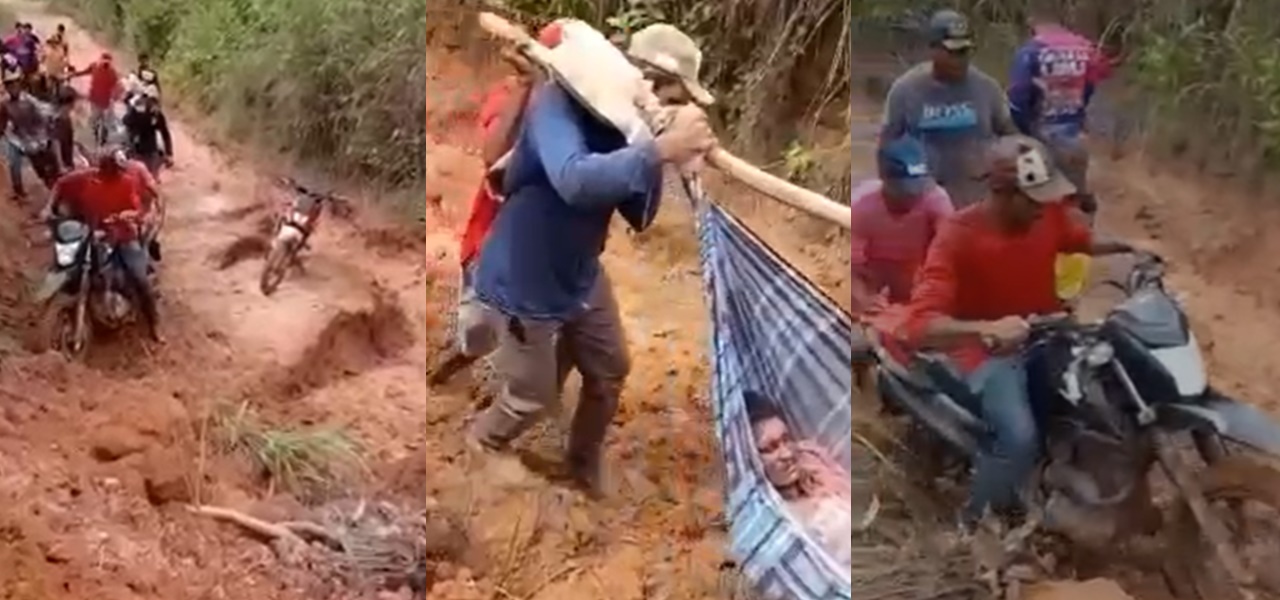 O acesso está tão intrafegável, cheio de buracos, que um doente precisa ser transportado em uma rede porque a ambulância não passa pelo local.
