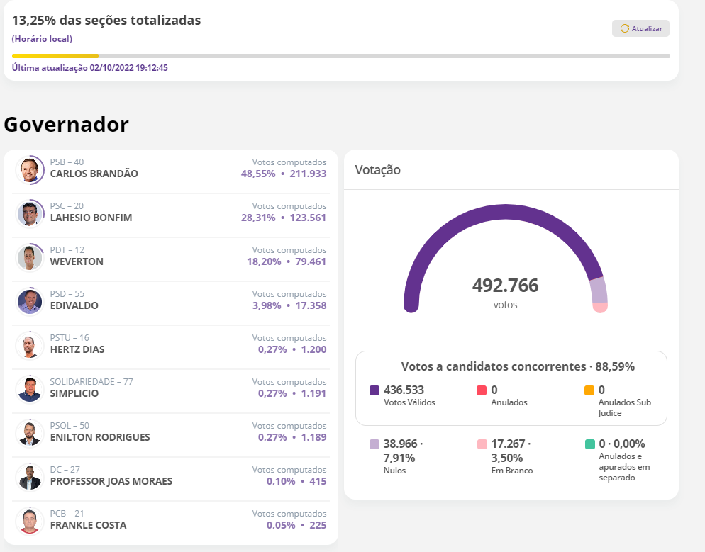 Carlos Brandão segue na liderança com 48,55% 02/10/202202/10/2022 | PÁGINA PRINCIPAL, Notícias Navegação de Post Brandão com 48,73% e Lahésio com 28,29%Com 41% das urnas apuradas, Lula diminui a diferença para Bolsonaro