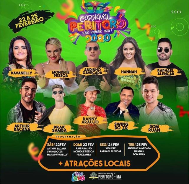 Considerado um dos melhores carnavais do Maranhão, a festa em Peritoró tem reunido multidão desde o início do período momesco, sábado, dia 22, e vem lotando cada vez mais no domingo e hoje, segunda-feira, dia 24. Amanhã. terça-feira, dia 25, o encerramento será marcante, com Andinho Xavecada, Hannah, Dom Ruan e Lucas Seabra.