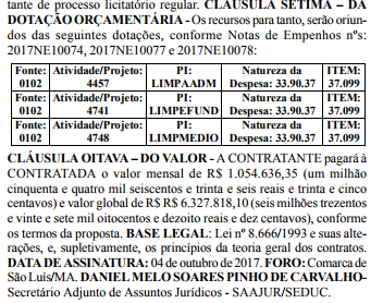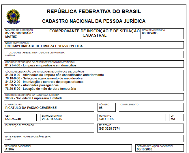O ramo da empresa mudou. É a UNILIMPS – Unidade de Limpeza e Serviços Ltda, que ficará responsável pelo serviço de limpeza, desinfecção, higienização e conservação de áreas (internas e externas nas instalações físicas e mobiliários.