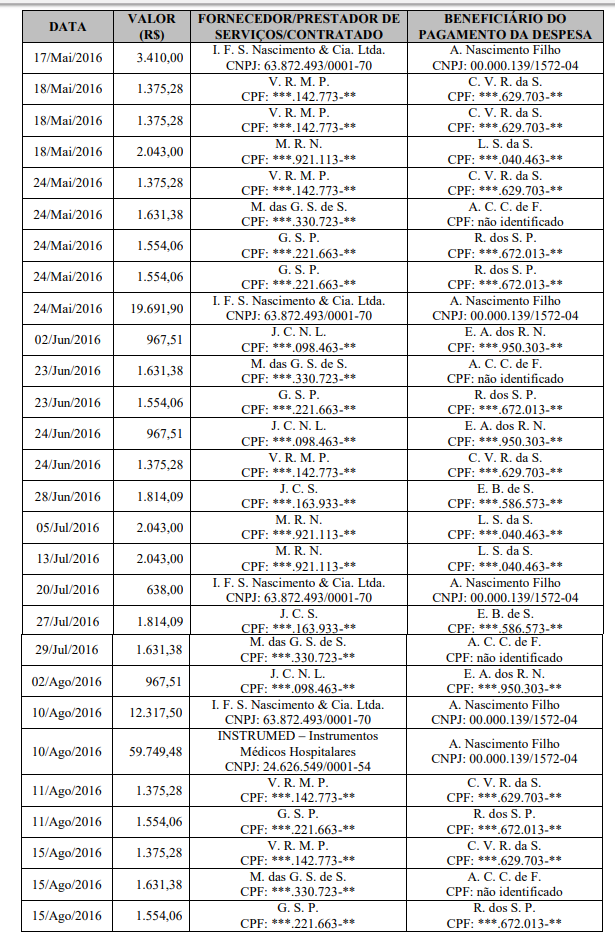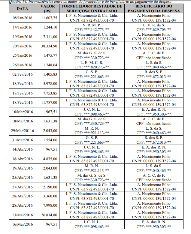 As informações acima descritas dizem respeito ao exercício de 2016. Veja os detalhes das transferências indevidas abaixo;