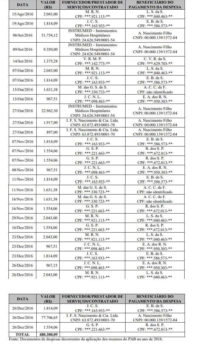 De acordo com a auditoria da Controladoria-Geral da União (CGU), o Executivo Municipal transferiu valores altos para contas correntes de pessoas físicas ou jurídicas distintas dos beneficiários, contratados, fornecedores ou prestadores de serviços identificados nas notas de empenho, ordens de pagamentos, contratos ou notas fiscais e faturas de fornecimento de bens, materiais produtos ou de serviços prestados à Secretaria Municipal de Saúde.