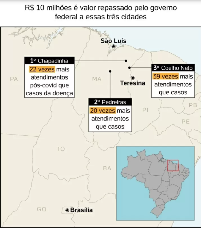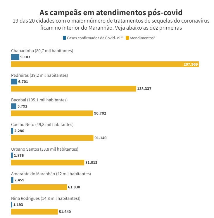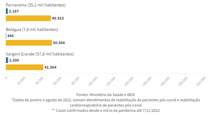 Mais atendimentos que o dobro da população. Considerando todos os atendimentos pós-covid realizados entre janeiro e junho — não apenas a reabilitação cardiorrespiratória — em Chapadinha, a soma foi de 206.920. O número corresponde a cerca de duas vezes e meia a população, de 80 mil habitantes. A cidade explica alto número dizendo que um mesmo paciente pode passar por até 20 atendimentos em um único mês, que sua população está subestimada e que a estimativa para 2023 é de 100 mil habitantes.