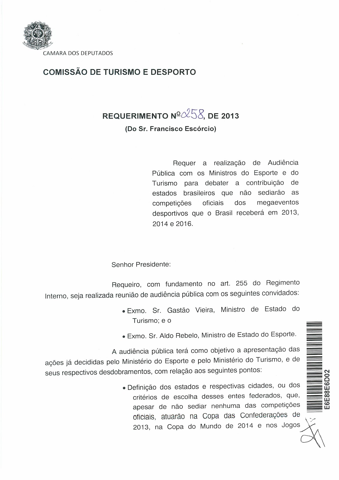 O deputado federal Francisco Escórcio (PMDB-MA) apresentou requerimento para a realização de audiência pública com o ministro do Esporte, Aldo Rebelo, e do Turismo, Gastão Vieira, para debater a contribuição de estados brasileiros que não sediarão as competições oficiais dos megaeventos desportivos que o Brasil receberá, como a Copa das Confederações em 2013, a Copa do Mundo em 2014 e as Olimpíadas de 2016.