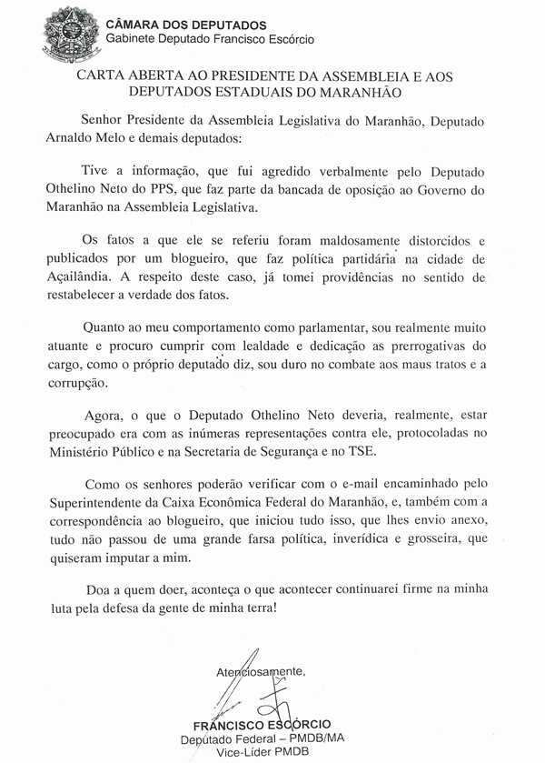 O deputado federal Francisco Escórcio, vice-líder do PMDB na Câmara Federal, respondeu nesta quinta-feira (09), em carta enviada ao blog do Neto Ferreira, a acusação do deputado estadual, Othelino Neto, membro da Bancada de Oposição na Assembleia Legislativa do Maranhão.