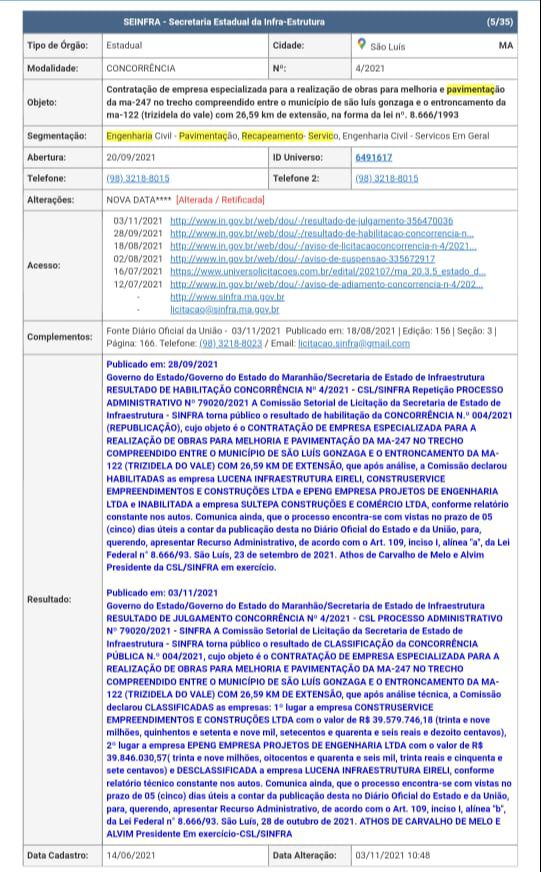 Segundo a Ata da sessão licitatória, a construtora, que fica localizada em Codó, concorreu ao certame com outras empreiteiras, que ofertaram preços relativamente maiores.