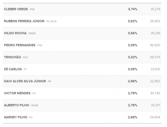 Cléber Verde volta a liderar a lista dos candidatos a deputado federal 05/10/2014 | PÁGINA PRINCIPAL, Notícias Navegação de Post Rubens Pereira 3,77%; Pedro Fernandes 3,68% e Cleber Verde 3,67% são os destaquesRoberto Rocha continua em primeiro na lista de candidato para senador