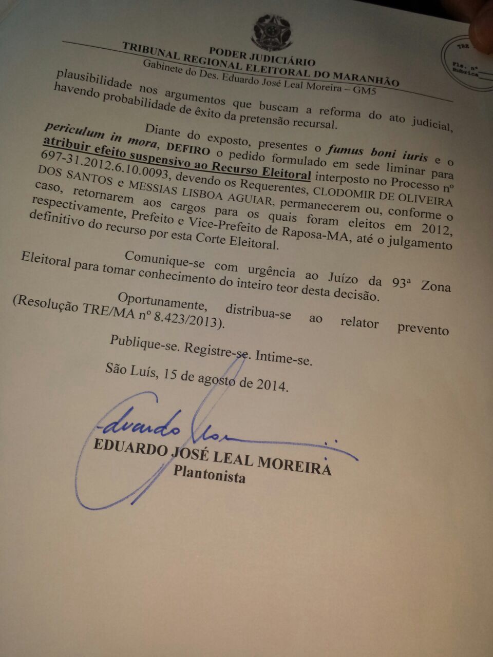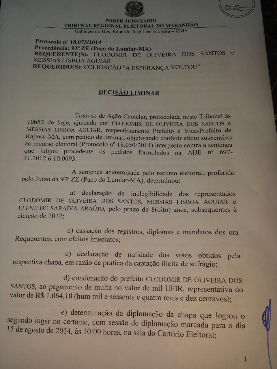 Na tarde desta sexta-feira (15), o prefeito da Raposa, Clodmir de Oliveira (PRTB), que estava afastado do cargo desde a última quarta-feira (13), conseguiu com o desembargador Eduardo Jose Leal Moreira, uma liminar que o garante retornar ao cargo de prefeito.