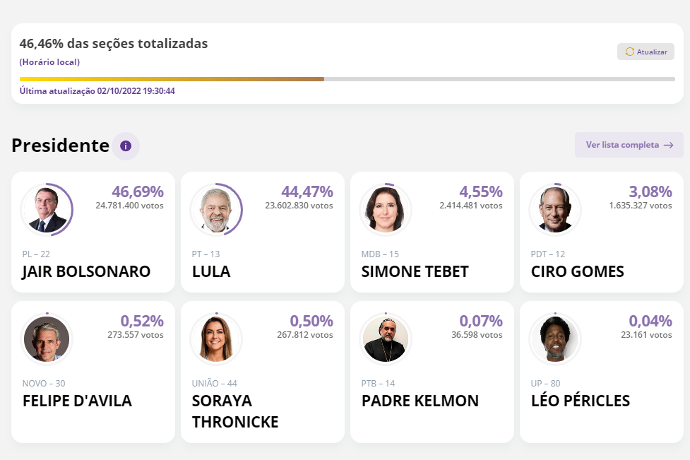 Com 46,4% das urnas apuradas, vantagem de Bolsonaro cai em relação a Lula 02/10/2022 | PÁGINA PRINCIPAL, Notícias Navegação de Post Com 41% das urnas apuradas, Lula diminui a diferença para BolsonaroCom 26,6% das urnas apuradas, Brandão segue liderando disputa