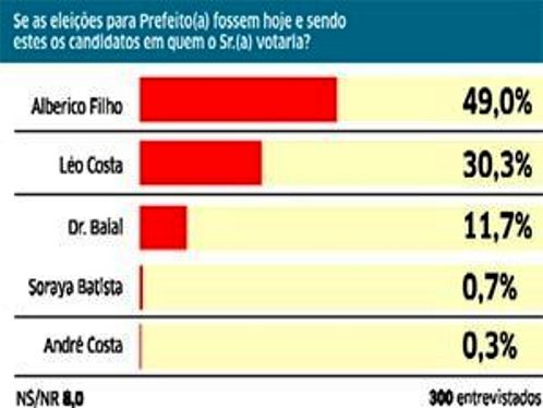 Na espontânea, Alberico permanece na casa dos 49%, enquanto Léo Costa aparece com 25,7%; Dr. Baial tem 8,7%. Os candidatos que não foram citados não pontuaram. Não sabem ou não quiseram responder, 16,3%.