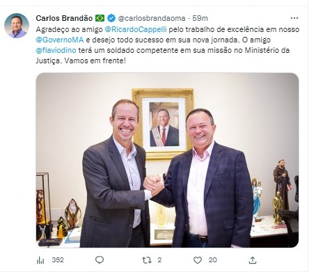 O governador Carlos Brandão anunciou a saída do jornalista Ricardo Cappelli do comando da Secretaria Estadual de Comunicação (SECOM) nesta manhã (30). O comunicado foi feito em sua conta no Twitter.