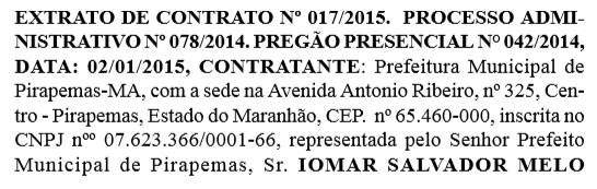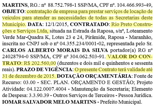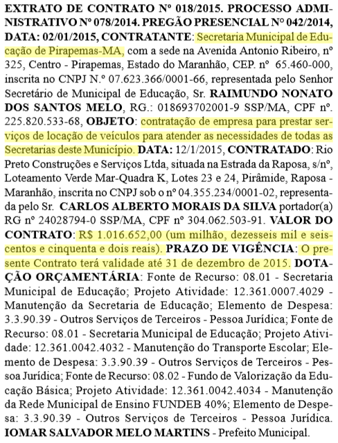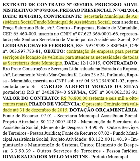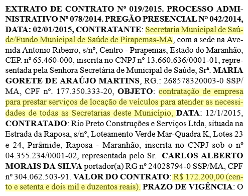 A Rio Preto Construções Ltda, localizada no bairro da Pirâmide em São Luís, será a responsável pela locação de veículos ao município de Pirapemas, para atender a demanda em diversas secretarias.