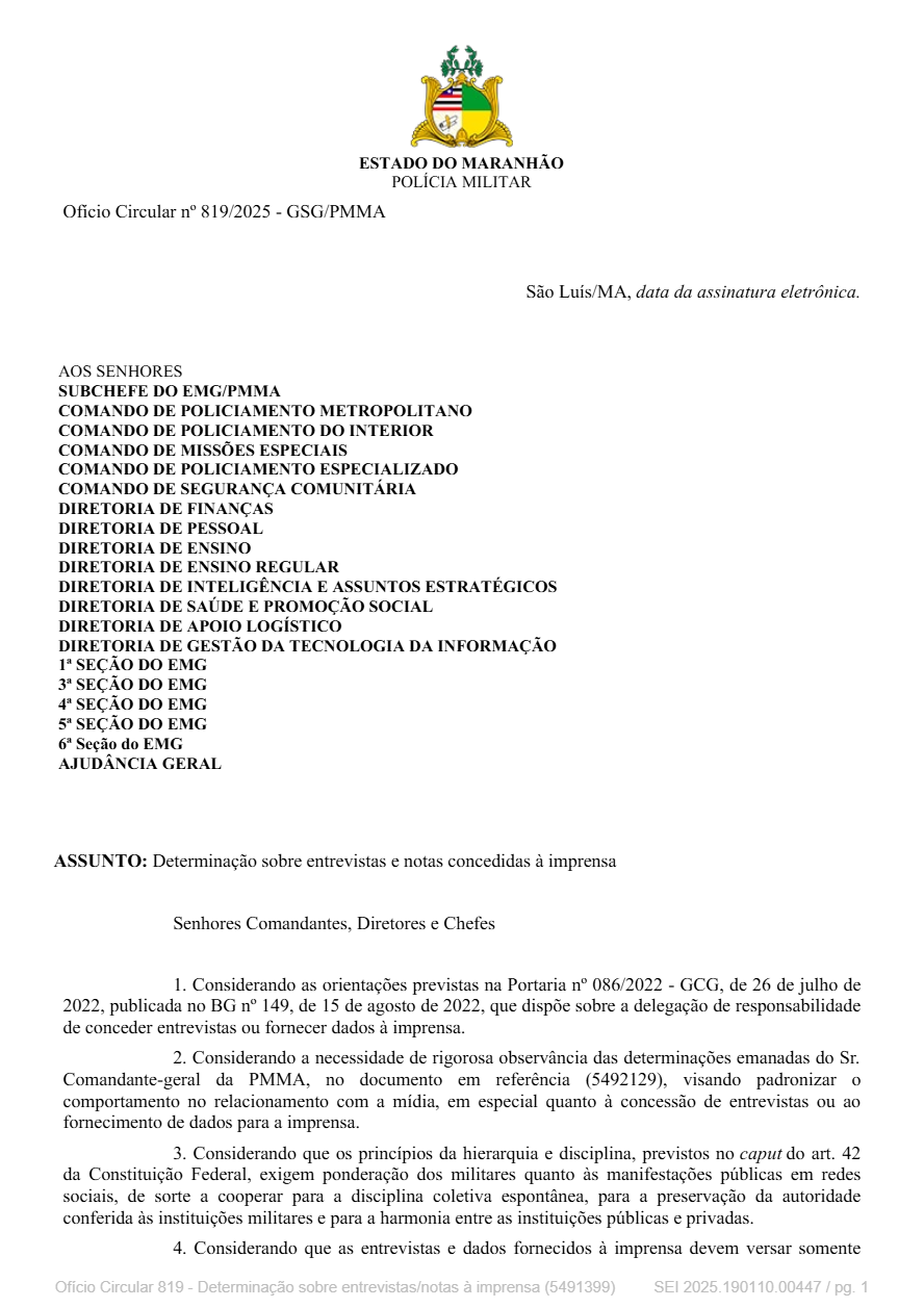O Comando da Policia Militar do Maranhão emitiu um Ofício Circular nº 819/2025, assinado pelo Subcomandante-Geral, Coronel Francisco Wellington Silva de Araújo, onde impõe regras aos militares sobre declarações públicas à imprensa. O documento foi publicado pelo site Folha do Maranhão.