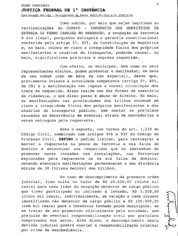Através de uma liminar decretada pelo juiz federal Jorge Ferraz de Oliveira Junior, o Consórcio dos Municípios da Estrada de Ferro Carajás no Maranhão (COMEFC), foi notificado em caso de participação em qualquer tipo de manifestação que ocorra ao longo da ferrovia. Na decisão liminar, o COMEFC pagará R$ 100 mil reais em caso de descumprimento da mesma, e deve permanecer a uma distância mínima de 30 metros dos trilhos.