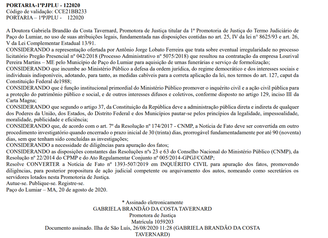 Segundo o documento, o procedimento investigatório irá apurar se de fato houve irregularidades na contratação da empresa Lourival Pereira Martins – ME pelo Executivo luminense para aquisição de urnas funerárias e serviço de formolização.
