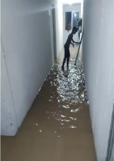Nas imagens é possível ver que a água invadiu os apartamentos localizados no térreo e carros que estavam no estacionamento do residencial causando sérios prejuízos àqueles residem nos imóveis.
