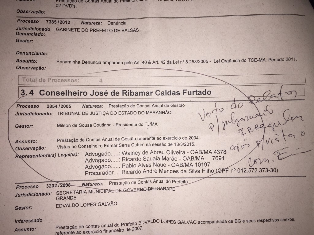Durante a sessão, o conselheiro José de Ribamar Caldas Furtado enxergou ilícitos e votou pela reprovação das atividades financeiras da gestão de Coutinho quando presidente do Tribunal de Justiça.