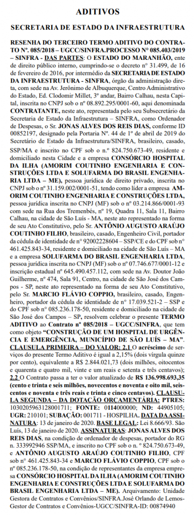 O Blog do Neto Ferreira apurou que o segundo termo aditivo firmado entre a Sinfra e o Consórcio, administrado por Antônio Augusto Araújo Coutinho Filho, foi de R$ 4.073.781,46 milhões. No extrato publicado pelo próprio órgão estadual consta que o valor atualizado com o acréscimo ficou em R$ 138.228.453,08 milhões o que diverge da informação contida no terceiro aditivo.