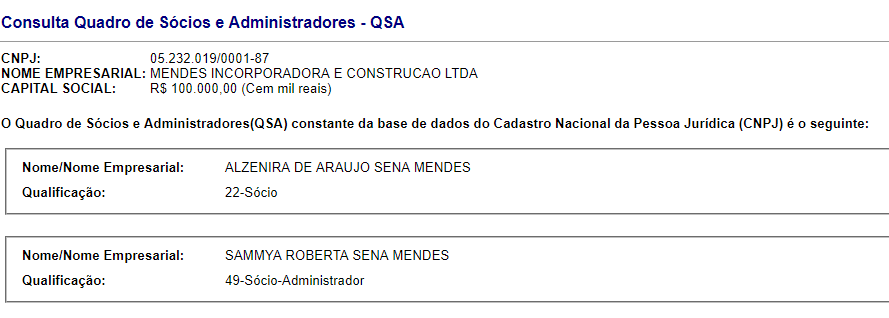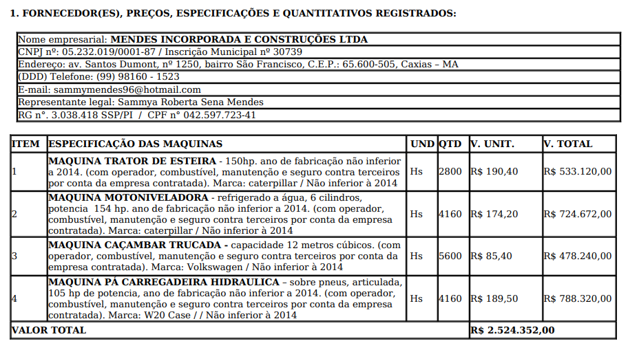 Ainda de acordo com o extrato, o Executivo Municipal contratou a empreiteira, que tem como sócias Alzenira de Araújo Sena Mendes e Sammya Roberta Sena Mendes, com o objetivo de locar máquinas pesadas.