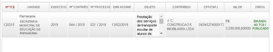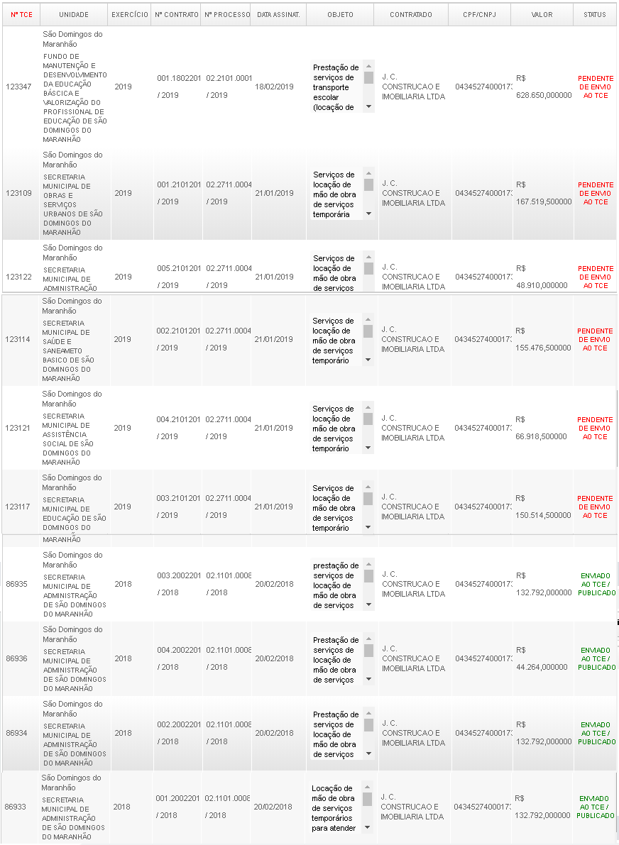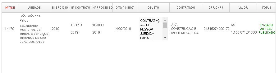 Ainda de acordo com dados do TCE, na Prefeitura de São João dos Patos a construtora ganhou R$ 1.153.071,84 milhão em contrato celebrado também no começo de 2019.
