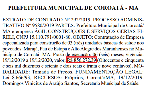Para construir 3 unidades básicas de saúde em Povoados de Coroatá, a empresa Ágil Construções e Serviços Gerais vai faturar R$ 856.272,39 mil.