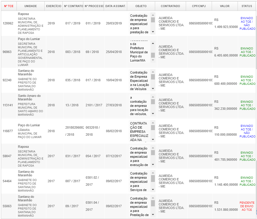 Em 2017, a Almeida Comércio faturou outro acordo contratual, agora, na Raposa, que é comandada por Talita Laci. O valor girou em torno de R$ 481.785,96 mil. Já em 2019, a empreiteira voltou a ser contratada pelo Município pelo montante de R$ 1.499.923,93 milhão.