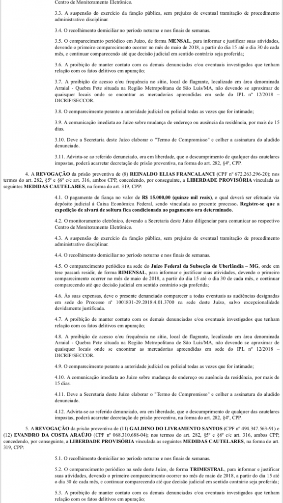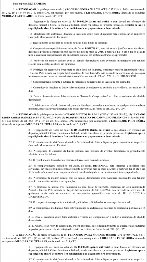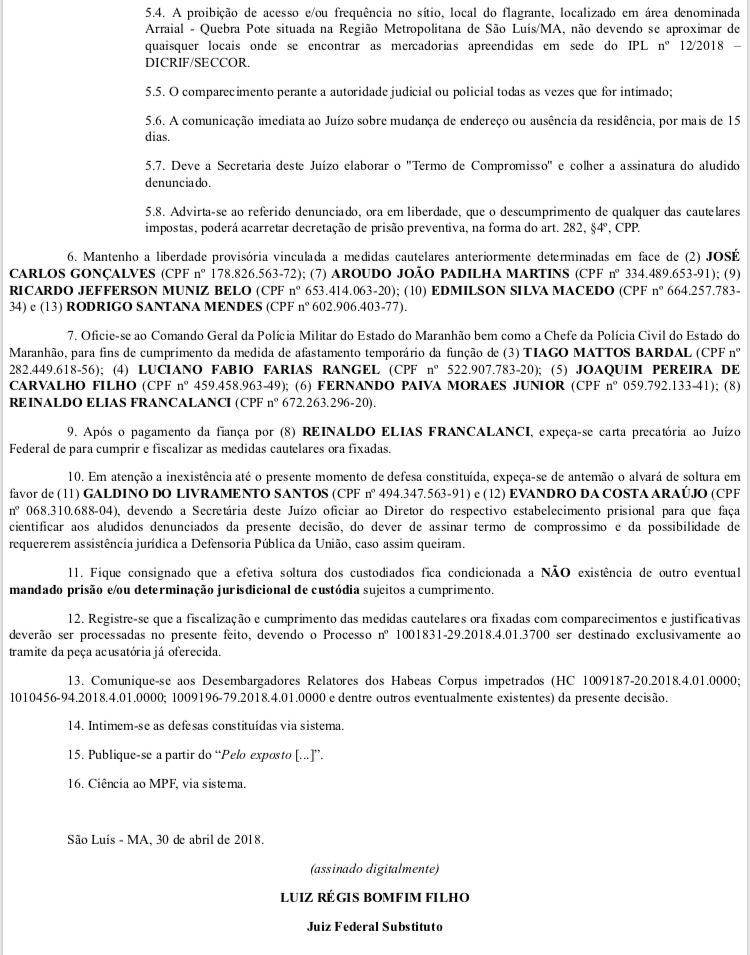 O juiz federal Luís Regis Bomfim Filho, da 1ª Vara Criminal da Justiça Federal no Maranhão, mandou soltar o delegado de Polícia Civil, Thiago Bardal, os policias militares e o ex-vice-prefeito de São Mateus, Rogério Sousa Garcês Garcia. Eles foram denunciados por integrarem organização criminosa especializada no contrabando de cigarros e descaminho de bebidas para São Luís (reveja).