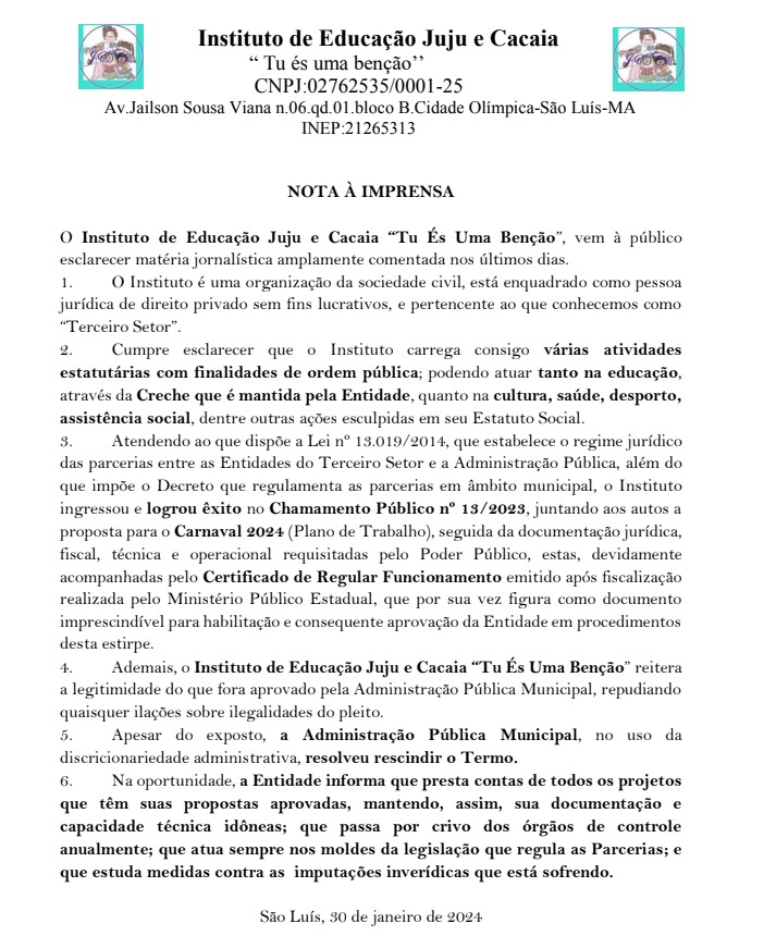 “Atendendo ao que dispõe a Lei no 13.019/2014, que estabelece o regime jurídico das parcerias entre as Entidades do Terceiro Setor e a Administração Pública, além do que impõe o Decreto que regulamenta as parcerias em âmbito municipal, o Instituto ingressou e logrou êxito no Chamamento Público no 13/2023, juntando aos autos a proposta para o Carnaval 2024 (Plano de Trabalho), seguida da documentação jurídica, fiscal, técnica e operacional requisitadas pelo Poder Público, estas, devidamente acompanhadas pelo Certificado de Regular Funcionamento emitido após fiscalização realizada pelo Ministério Público Estadual, que por sua vez figura como documento imprescindível para habilitação e consequente aprovação da Entidade em procedimentos desta estirpe”, diz trecho da nota.