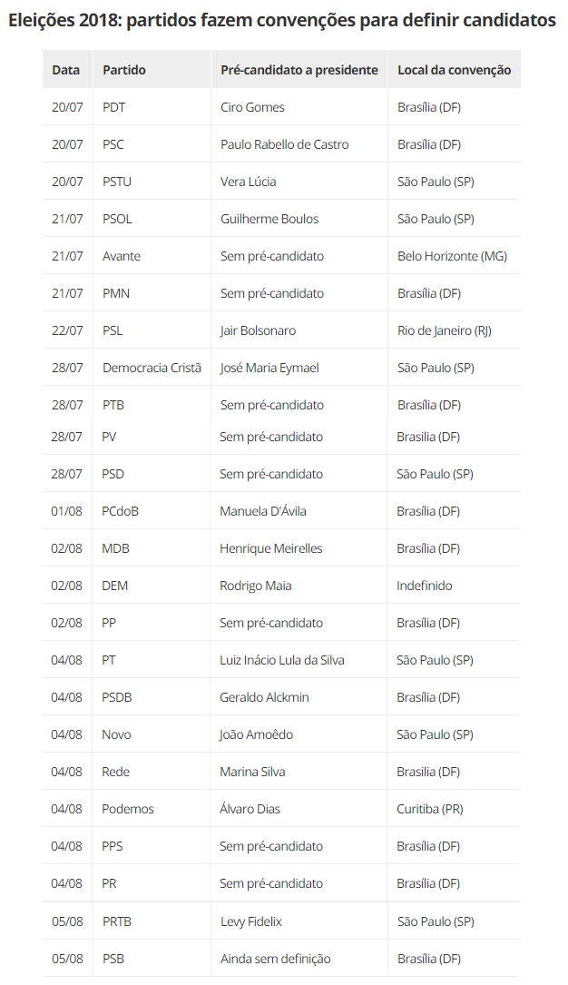 Muitos partidos lançaram pré-candidatos a presidente da República nos últimos meses, entre os quais PT (Luiz Inácio Lula da Silva), PSDB (Geraldo Alckmin), MDB (Henrique Meirelles), PSOL (Guilherme Boulos), PCdoB (Manuela D’Ávila), PSL (Jair Bolsonaro), Rede (Marina Silva), PDT (Ciro Gomes) e DEM (Rodrigo Maia).