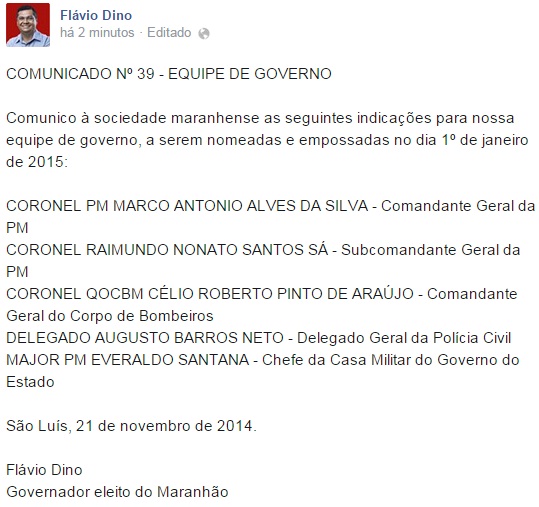 O comunista e governador eleito, Flávio Dino (PCdoB), confirmou na manhã desta sexta-feira (21), o nome de Coronel Alves para o Comando Geral da Polícia Militar do Maranhão.
