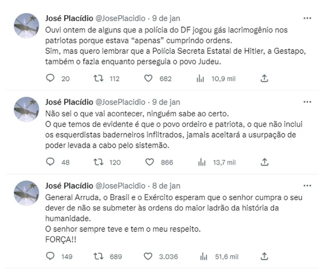 Ainda no dia dos atos terroristas, Placídio conclama as Forças Armadas a atuarem. “Brasília está agitada com a ação dos patriotas. Excelente oportunidade para as FA entrarem no jogo, desta vez do lado certo. Onde estão os briosos coronéis com a tropa na mão?”, publicou.