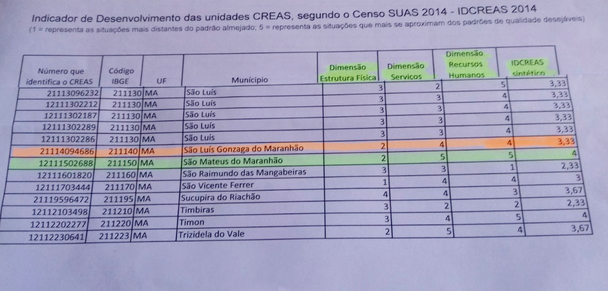 Enquanto o CREAS de São Mateus do Maranhão apresentou um ótimo empenho, os de São Luís deixaram muito a desejar. Das cinco unidades avaliadas, só uma obteve um critério 5. Todas tiveram a média final de 3,33. Confira: