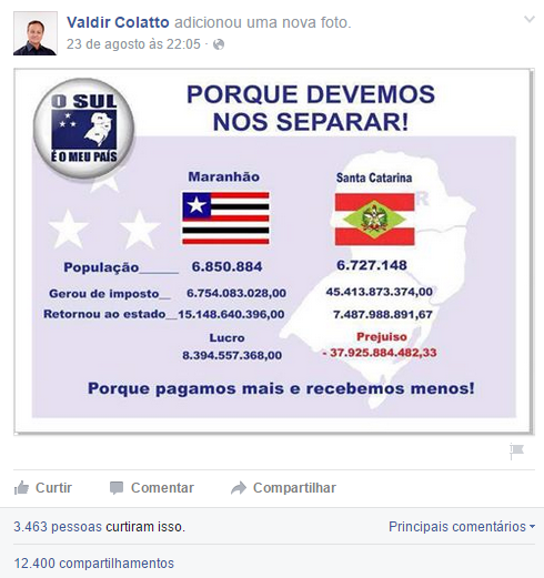 No domingo (23), um deputado federal de Santa Catarina, Valdir Colatto (PMDB-SC), publicou em seu perfil na rede social, uma imagem que representa a separação da Região Sul do país, usando o Maranhão como estado federado dependente e desimportante quando comparado a população entre ambos e impostos gerados entre estes.