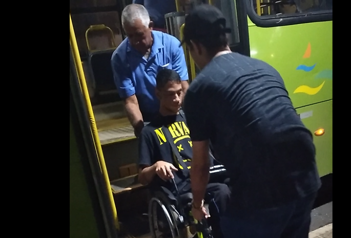 Imagens mostram o momento em que o jovem Kaio, de apenas 25 anos, portador de deficiência física crônica ser ver obrigado a ser carregado pelo motorista do ônibus coletivo da empresa Grupo Primor TCM, que fazia linha Raposa/Cohama, para poder chegar ao seu destino.