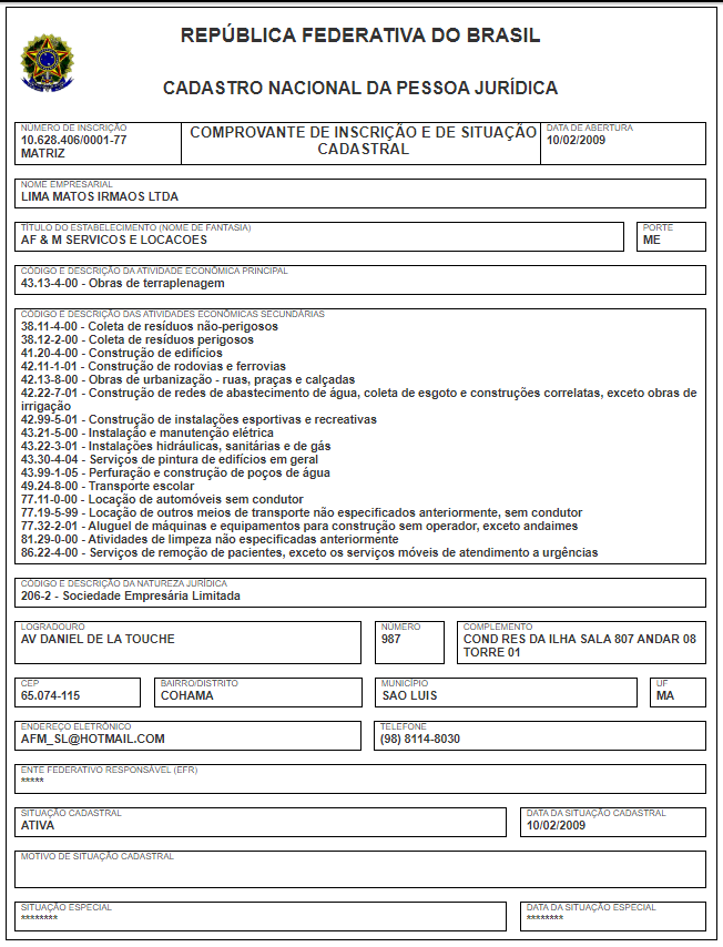 Segundo o documento, a A.F. & M. Construtora, localizada em São Luís e dos sócios Anderson Wesley Lima Matos e Ítalo Raphael Lima Matos, foi contratada pela Administração Municipal para locar veículos para a atender a demanda da Secretaria de Saúde nos execícios de 2018 e 2019.