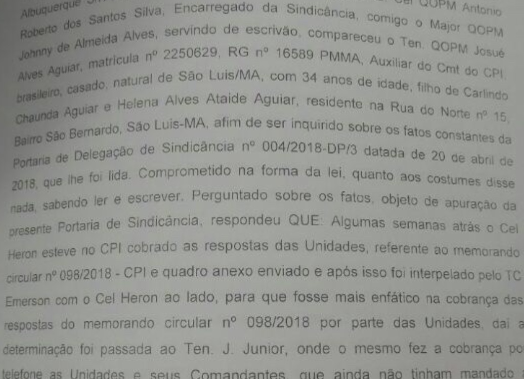 No depoimento do tenente Josué Alves Aguiar, responsável pelo setor de digitação do Comando da PM no Interior, é relatado que a major Ana Paula, subordinada, foi pressionada pelo coronel Heron para dá celeridade.
