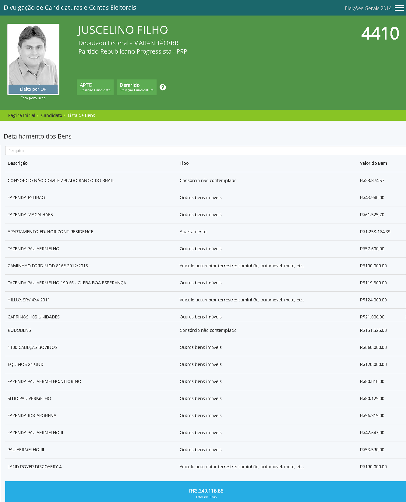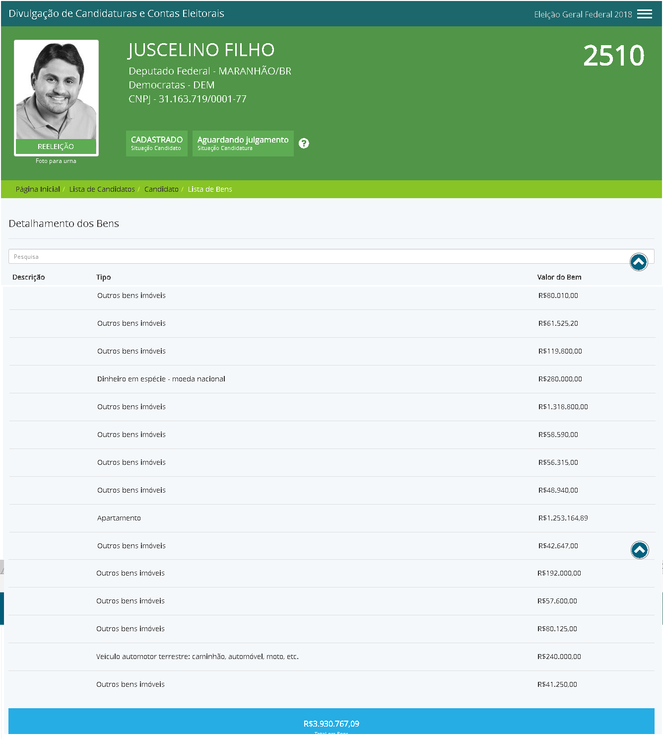 O deputado federal e candidato a reeleição, Juscelino Filho (DEM), declarou um patrimônio R$3.930.767,09 milhões ao Tribunal Superior Eleitoral (TSE).