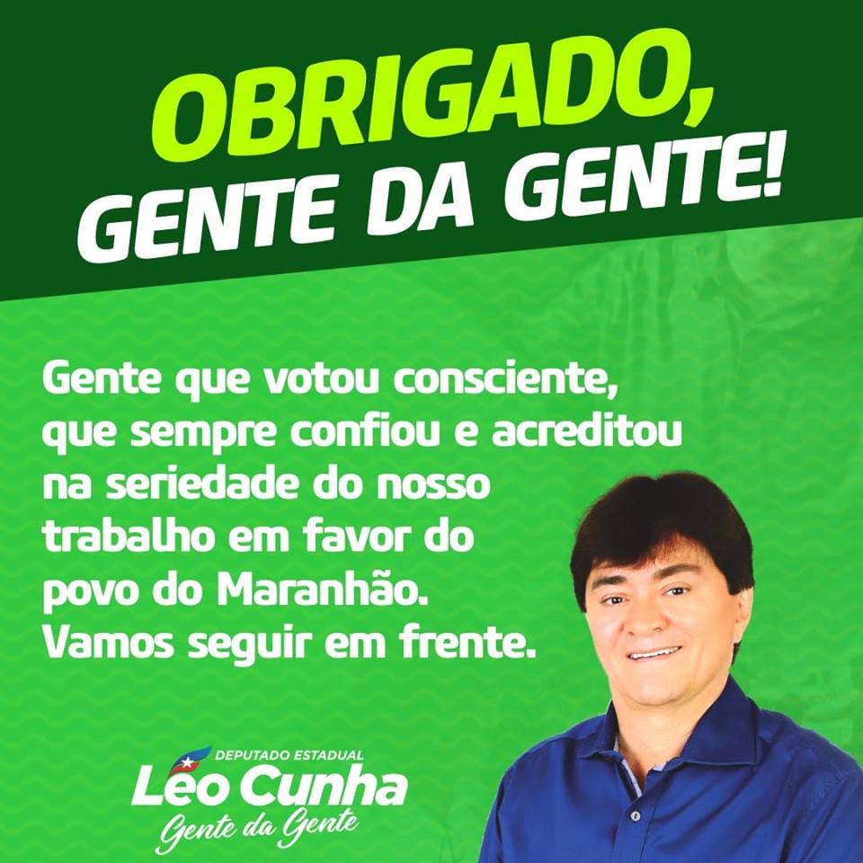 O deputado estadual Léo Cunha (PSC), publicou nas redes sociais uma nota de agradecimento pelos votos recebidos em todo o Maranhão, especialmente na região tocantina, onde conquistou o apoio, a confiança e a credibilidade do povo com o seu trabalho durante os três mandatos como deputado estadual na Assembleia Legislativa do Maranhão.