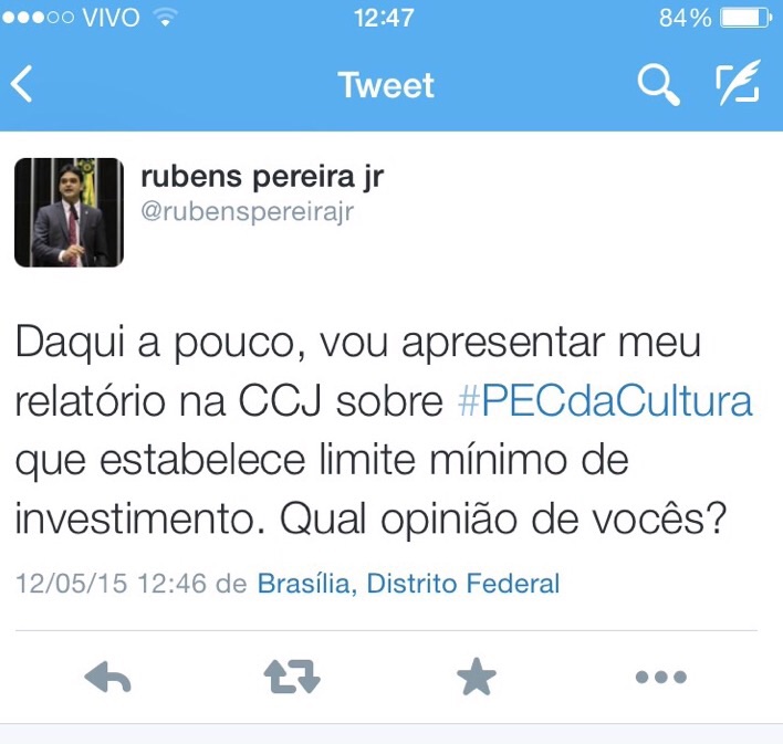 O deputado federal Rubens Pereira Junior anda mesmo desprestigiado. Em uma publicação no twitter, o parlamentar pediu a opinião dos twitteiros quando disse que iria apresentar o seu relatório da CCJ sobre a PEC da cultura.